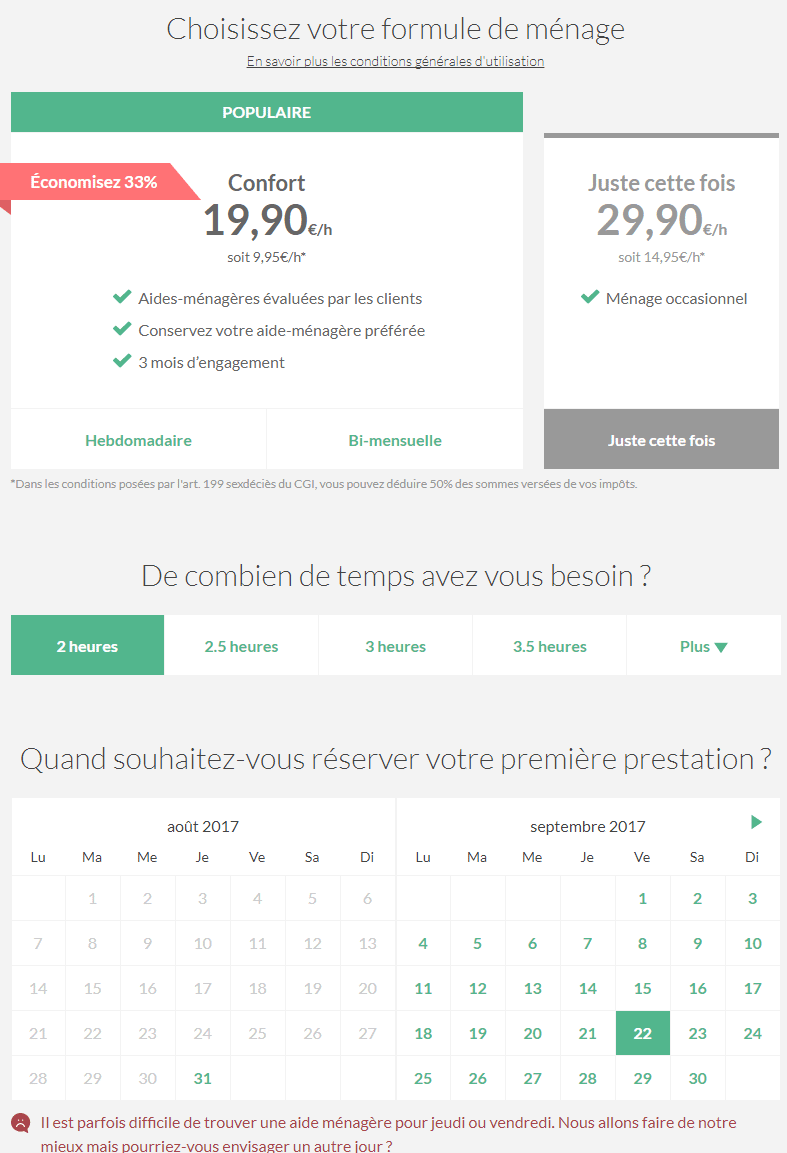 - Choisissez votre formule : soit « confort » qui est la formule la moins chère car hebdomadaire ou bi mensuelle avec engagement, soit la formule « one shot » qui est un peu plus chère mais permet de tester et de se rassurer pour une première fois.